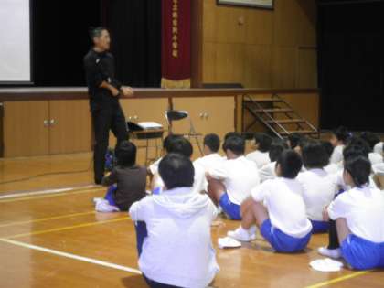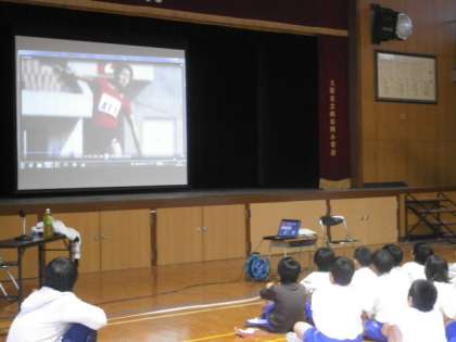 運動場で実技指導をしていただいた後、講堂で競技の映像を見せていただきました。