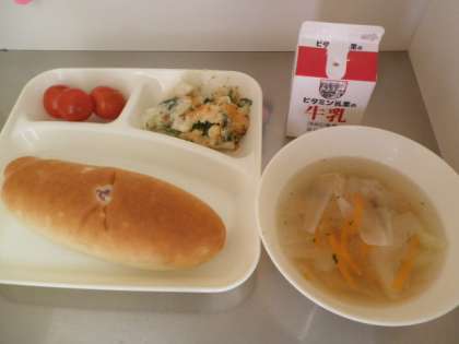 献立は、ホタテ貝のグラタン 大根のスープ プチトマト おさつパン 牛乳でした。