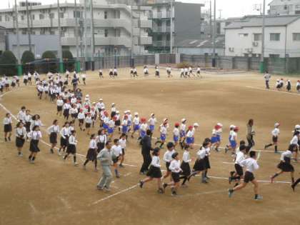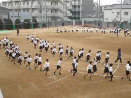 15日から体力作りの取り組みが始まりました。1時間目のあとの休み時間に、全学年がそろって運動場を走ります。
