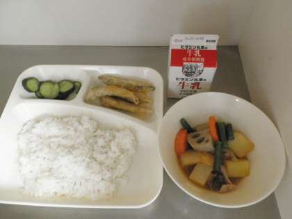 献立は、きびなごてんぷら 一口がんもと大根の煮物 あっさりきゅうり ごはん 牛乳でした。