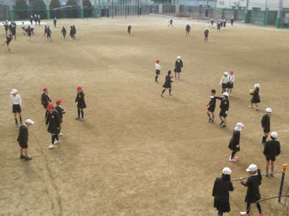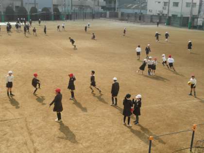 今日は天気が良く、運動場で元気に遊んでいる児童が多いです。