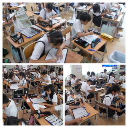くり返しの言葉や表現、また情景や様子、心の動きが感じられるように工夫を凝らし、自分のオリジナル短歌を作っていきます。今回は、習字の小筆を使い、世界に入り込みながら慎重に書きしたためています。
