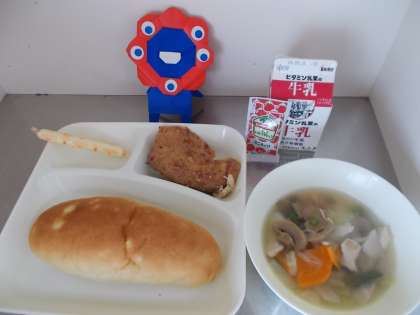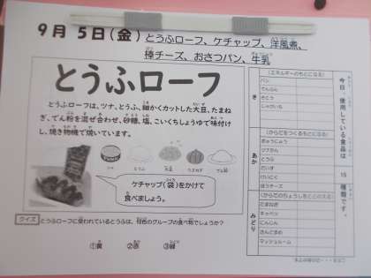 おさつパンは、そのまま食べても甘くておいしいですが、今日は、そのおさつパンに「とうふローフ」と「棒チーズ」をはさんで、ケチャップをかけ、おいしそうにほおばっていました。