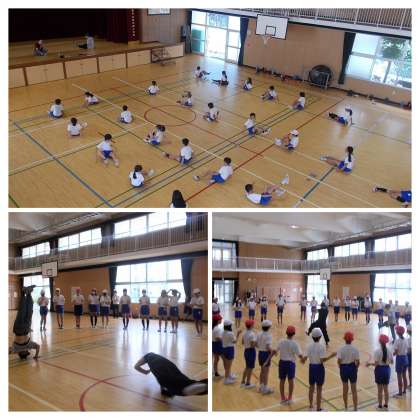 いま、体育で学習している「リズムダンス」にも活かせられますね! グループになって創作しているところで、そろそろ発表・相互鑑賞の時間となります。