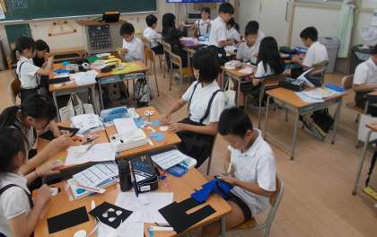 また、家庭科では『小物づくり』と題し、自分のティッシュペーパー入れやペンケースなどを裁縫しています。細かな作業なので、みんななかなか難しいようです‥‥
