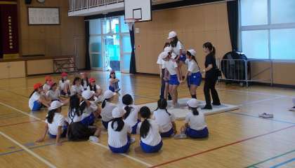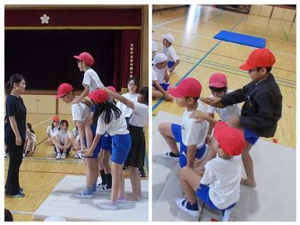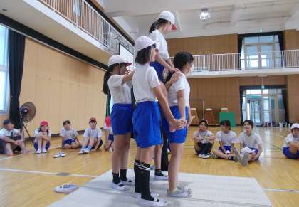 どこがいいかな、どうやったらいいかな‥‥安定する乗り方、支え方、動き方‥なかなか難しいようです。久しぶりの団体競技なので、みんなの協力が大切ですね。パワー!