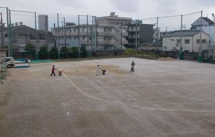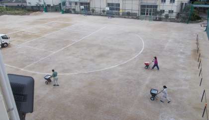 先週末の放課後に、にがりという塩化カルシウムを運動場に撒きました。水分を吸収して地面の湿度を保つことで、砂ぼこりの飛散を防いだり、表面のひび割れを防止したりします。