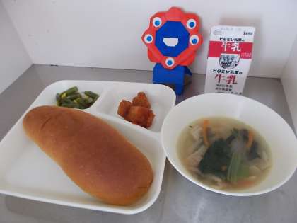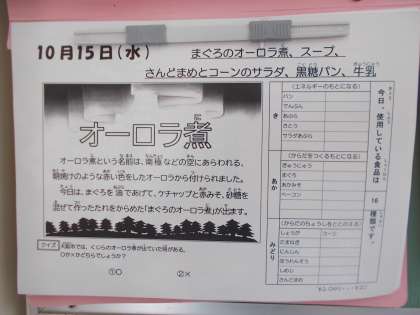1年生、国語科「サラダでげんき」の勉強中です。サラダを残さず食べて、元気になってね。