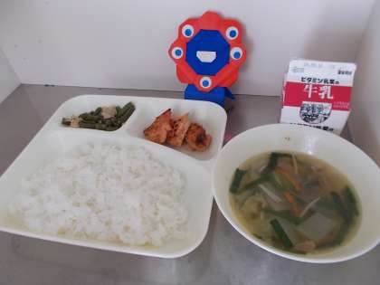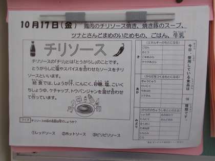 1年生、さんどまめと、お肉をご飯の上にのせて・・・