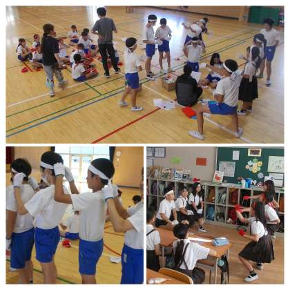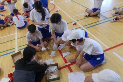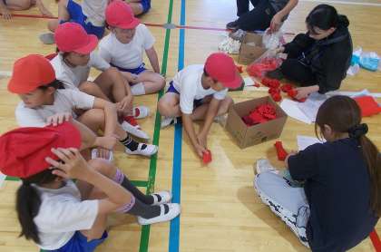 一通り「応援合戦」の流れが分かったみんなは、いよいよ担当の先生から軍手・ハチマキの授与式がありました。一気にヤル気がみなぎってきたようです!!