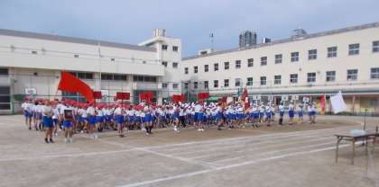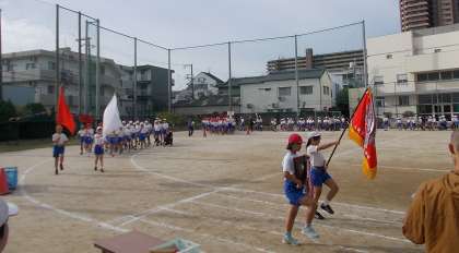 入場門から、校旗・優勝旗の担当や、各学年が順番に行進していき、運動場に整列をしました。