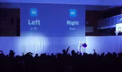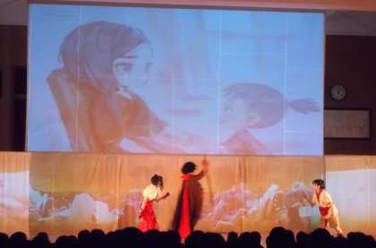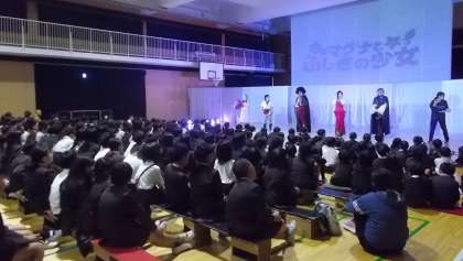 講堂に大きなスクリーンを設置し、大きな音響やカラフルな光で演出し、なんと英語も交えての劇が始まりました。