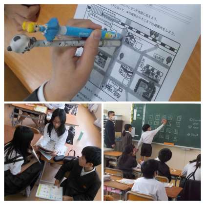 英語で「道案内」です。どうやって行くのか、どこの角で曲がるのか、仲睦まじく学び合いをしています。ステキですね♪