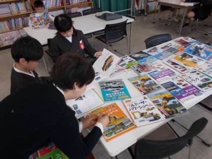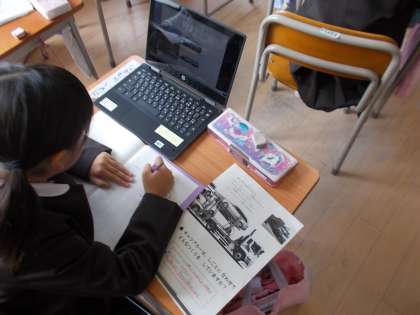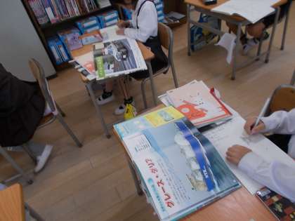 図書の時間に、辻先生が用意してくれた乗り物の本の中から、自分の好きな乗り物を選びました。選んだ乗り物の資料を一人一人コピーしていただいたので、子どもたちは自分の資料を読み込んで「やく目・つくり・できること」を見つけて印をつけ、ノートにまとめました。その他に知りたいことを、本やタブレットを使って調べました。知らなかったことが分かったときは「中にこんなものがあるんや すごい!」と言いながら、ノートに書き留めていました。