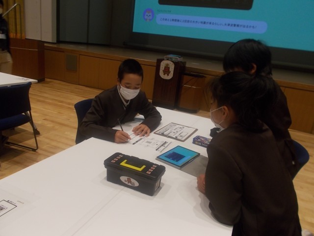 実際に災害が起きたときは、どのように行動すると良いのかということを児童のみんなで考え、班ごとに取り組みました。
