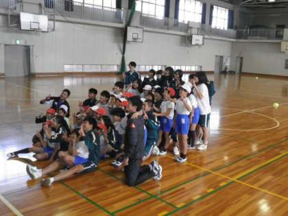 まず最初に,「ケイドロ」をしました。8分間見事に高校生から逃げ切りました。小学生の勝ちです。次に,ドッジボールをしました。小学生の速いボールに高校生も思わずびっくりしていました。最後に高校生と一緒に記念写真を撮りました。市岡高校の皆さん,ありがとうございました。