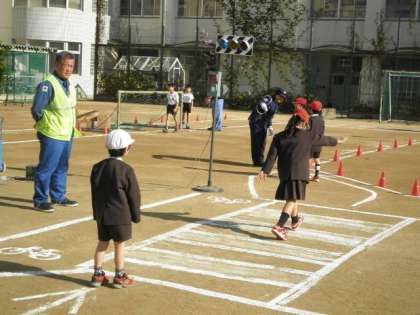 港警察と港区役所の方に来ていただいて、交通安全教室を開きました。