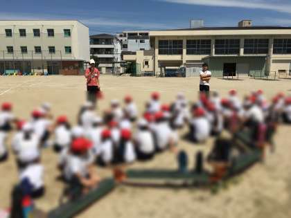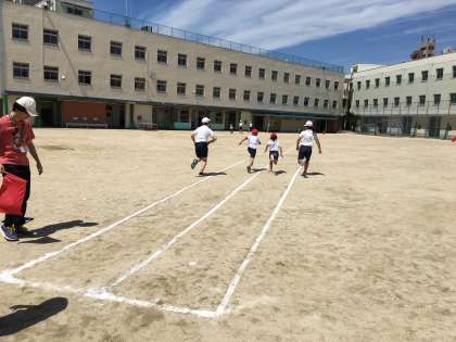 本年度の新体力テストは、異学年合同(1・6年、2・4年、3・5年)で行っています。上級生が下級生のお世話をしたり、見本を見せたりして取り組みました。