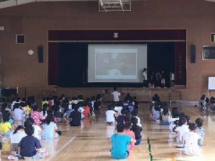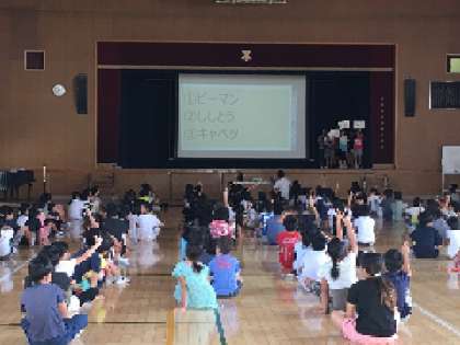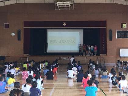 紙ごみ回収や、学習園の植物のお世話などの活動を行っていることを写真を提示しながら発表してくれました。また「やさい3たくクイズ」を行うなど、みんなが楽しめるように工夫をしていました。