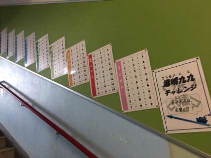 お気づきの方もいらっしゃるかもしれませんが、1号館の1階から2階にかけての階段壁面の掲示坂が新しくなりました。以前のものと比べ、大きくなりましたので児童の作品以外にも学習に関係するものも掲示しています。