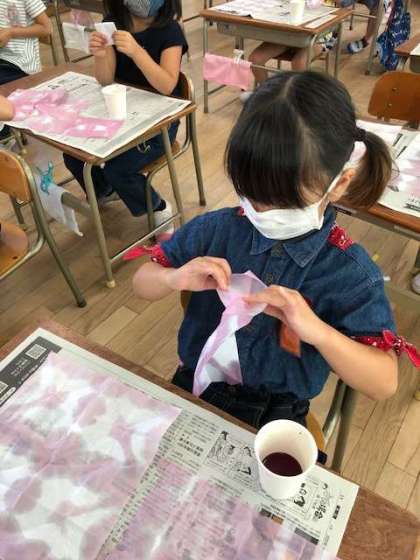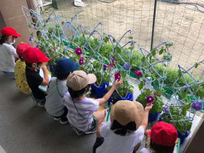1年生は5月から生活科の学習であさがおを大切に育ててきました。毎日水やりをしたり、観察をしたり、ときには図画工作科の学習とからめて、あさがおの花から色水をつくり、半紙にうつして模様づくりを楽しみました。また夏休みにチャレンジしてみても楽しそうですね!