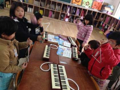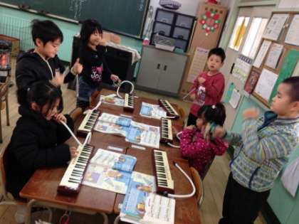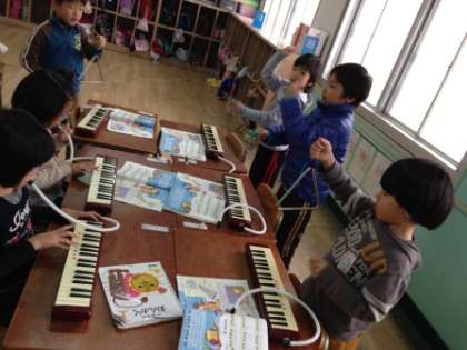 この日は、『きらきらぼし』を鍵盤ハーモニカ・すず・トライアングルで合奏しました。グループに分かれて、楽器の役割分担。リーダー中心に練習を進めます。
