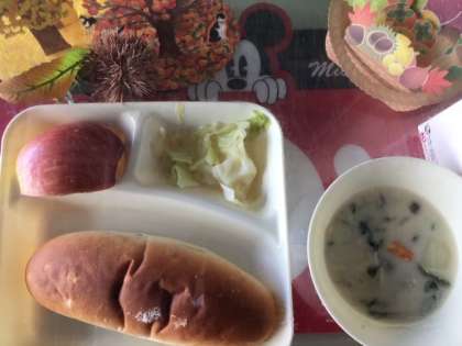 きのこのクリームシチュー、キャベツのピクルス、りんごです。