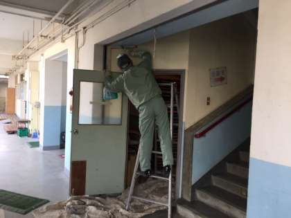シャッターの汚れたペンキをはがして、きれいに塗りなおしています。