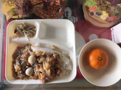 中華丼、もやしとさんどまめの中華あえ、みかんです。