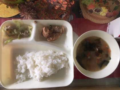 鶏肉のごまだれ焼き、なめこのみそ汁、キャベツのいためものです。