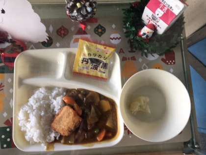 カツカレーライス、カリフラワーのピクルス、いり黒豆です。