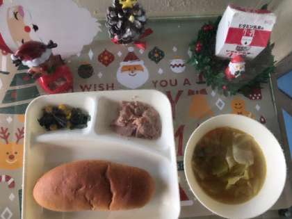 豚肉のガーリック焼き、スープ、ほうれんそうのソテーです。