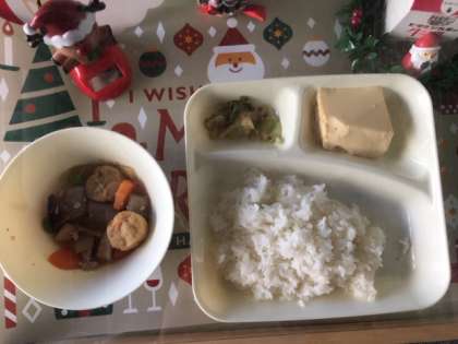 卵どうふ、鶏肉と一口がんもの煮もの、野菜のそぼろいためです。