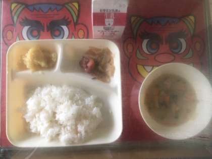 鶏肉の甘辛焼き、かす汁、くりきんとんです。