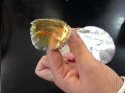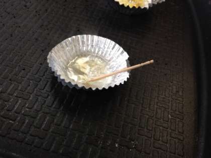 ホットプレートに、グラニュー糖と水を入れたアルミカップを置きじっくりと熱します。沸騰したら爪楊枝を入れ、色が変わったら引き上げて冷まします。