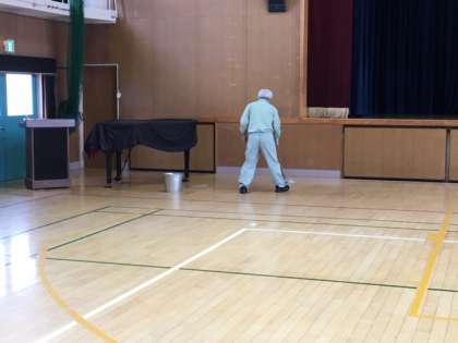 管理作業員さんが講堂の舞台と床のワックスがけを行っています。