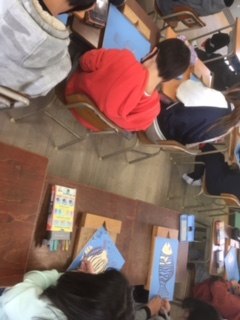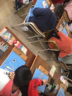 図画工作科で木版画に取り組んでいます。魚のうろこの模様を彫刻刀を使い丁寧に彫っています。初めて扱う道具なので、緊張しながら作業を進めています。