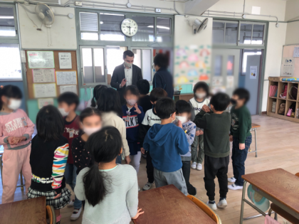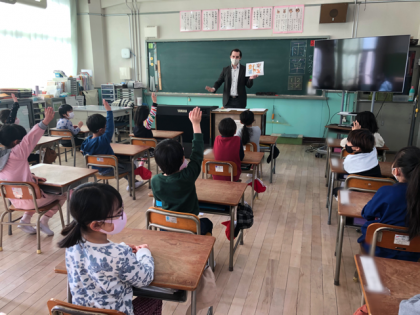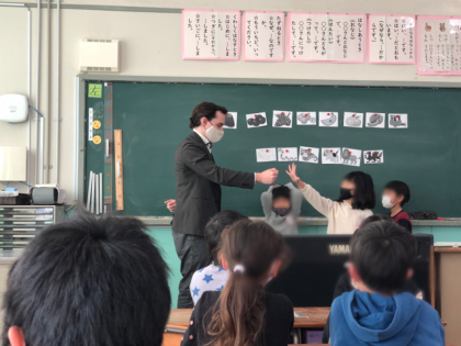 1時間目にジェイコブ先生と英語の学習をしました。ジェイコブ先生を前に目をキラキラさせて興味津々の1年生。ジェイコブ先生の出身国や、好きなものをクイズで当てたり、自己紹介ゲームをしたりして英語に親しむことができました。英語のジャンケンも教えてもらいました。明日から使えるね!と喜んでいました。