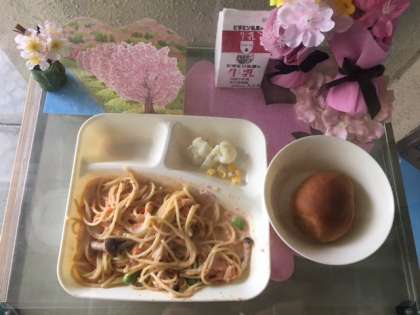 さけのクリームスパゲッティ、カリフラワーとコーンのサラダです。