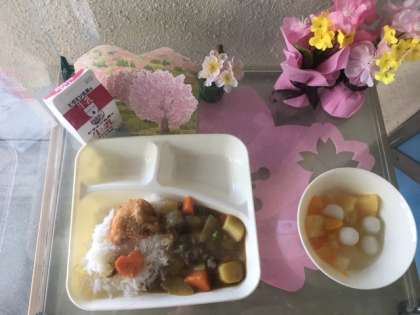カツカレーライス、フルーツ白玉です。入学祝い献立です。