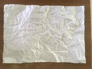 その後、6年では真っ白な紙をくしゃくしゃにする活動を通して、いじめについて考えました。最初に活動の意図を伝えずに紙をくしゃくしゃにした後の感想を聞くと、「楽しかった」「ストレス発散になった」という感想が出てきました。感想を聞いた後にこの活動の意図を伝え、この紙をくしゃくしゃにする行為がいじめにつながるということを伝えました。この白い紙にできたしわややぶれは人がいじめを受けた後の傷と一緒だということ、元通りの真っ白な紙には戻らないということに気づき、いじめは人の心や体に深く傷を残すということを考えました。