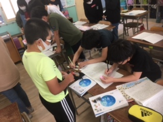 二枚目の写真は、総合的な学習の時間の様子です。防災について調べ学習をしています。グループで調べてきたことを種類ごとに分け、情報を整理しています。調べたことをポスターにして発表する予定です。