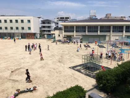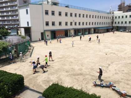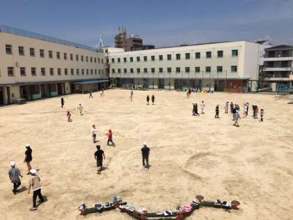 天気が良いので、たくさんの子どもたちが運動場に出ています。