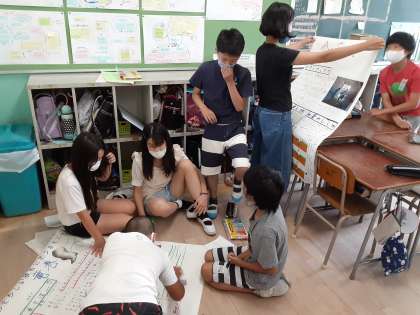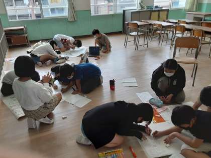 自分たちで調べたことを班ごとに模造紙にまとめています。協力して活動しています。
