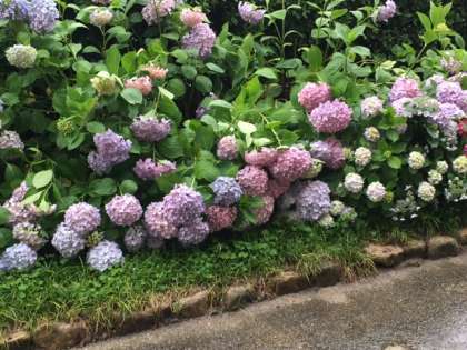紫陽花の花が雨を吸ってみんなおじぎをしています。