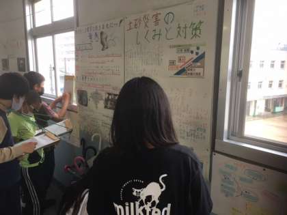 3つ目は、国語と総合的な学習の時間で防災についてのポスターを作成しました。それぞれのグループのポスターを見て、読む人の興味を引き付ける工夫を考えました。
