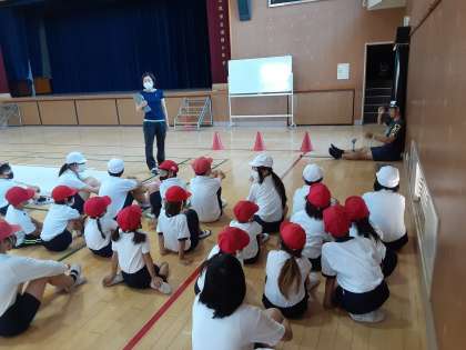 1年生と6年生が新体力テストに取り組んでいる様子です。