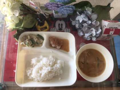 鶏肉のおろしじょうゆかけ、みそ汁、野菜いためです。