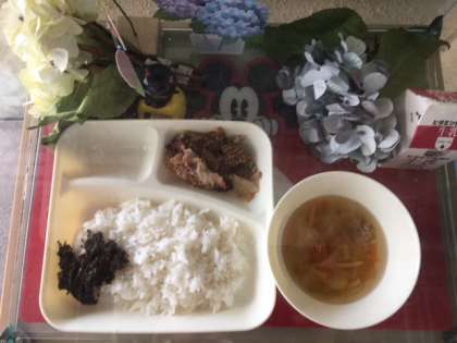 豚肉のごまみそ焼き、すまし汁、のりのつくだ煮です。