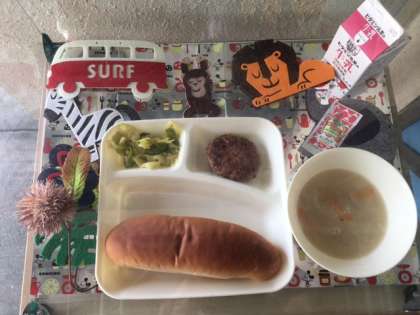 焼きハンバーグ、豆乳スープ、キャベツとピーマンのカレーソテーです。